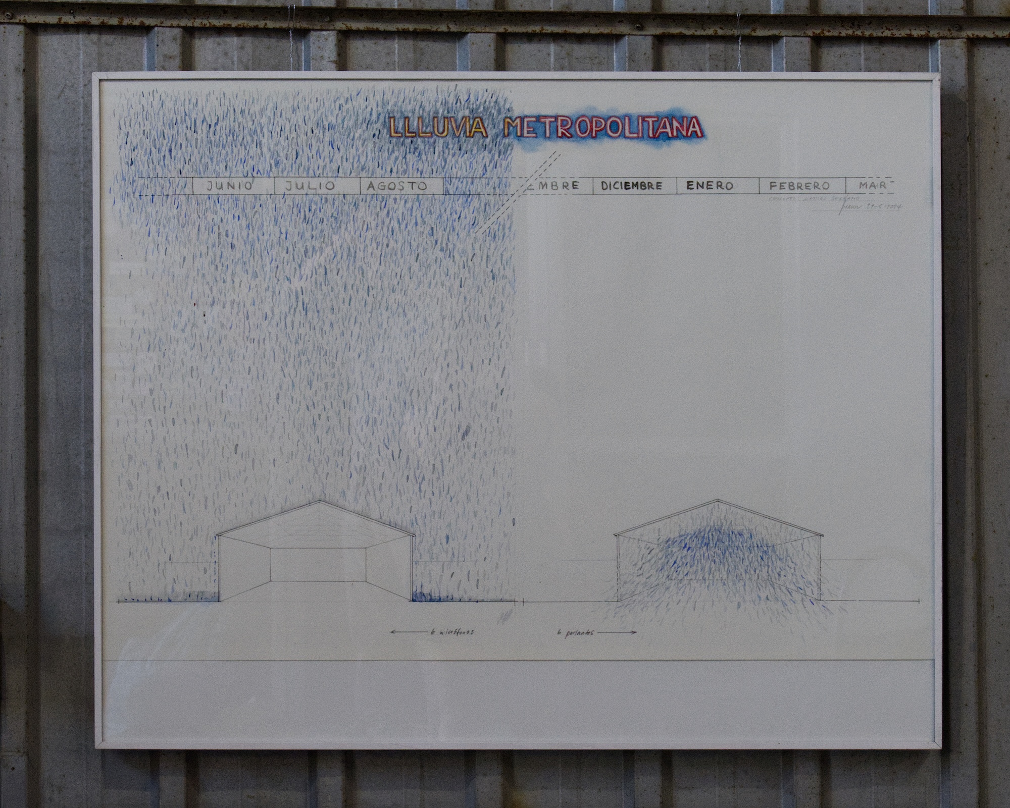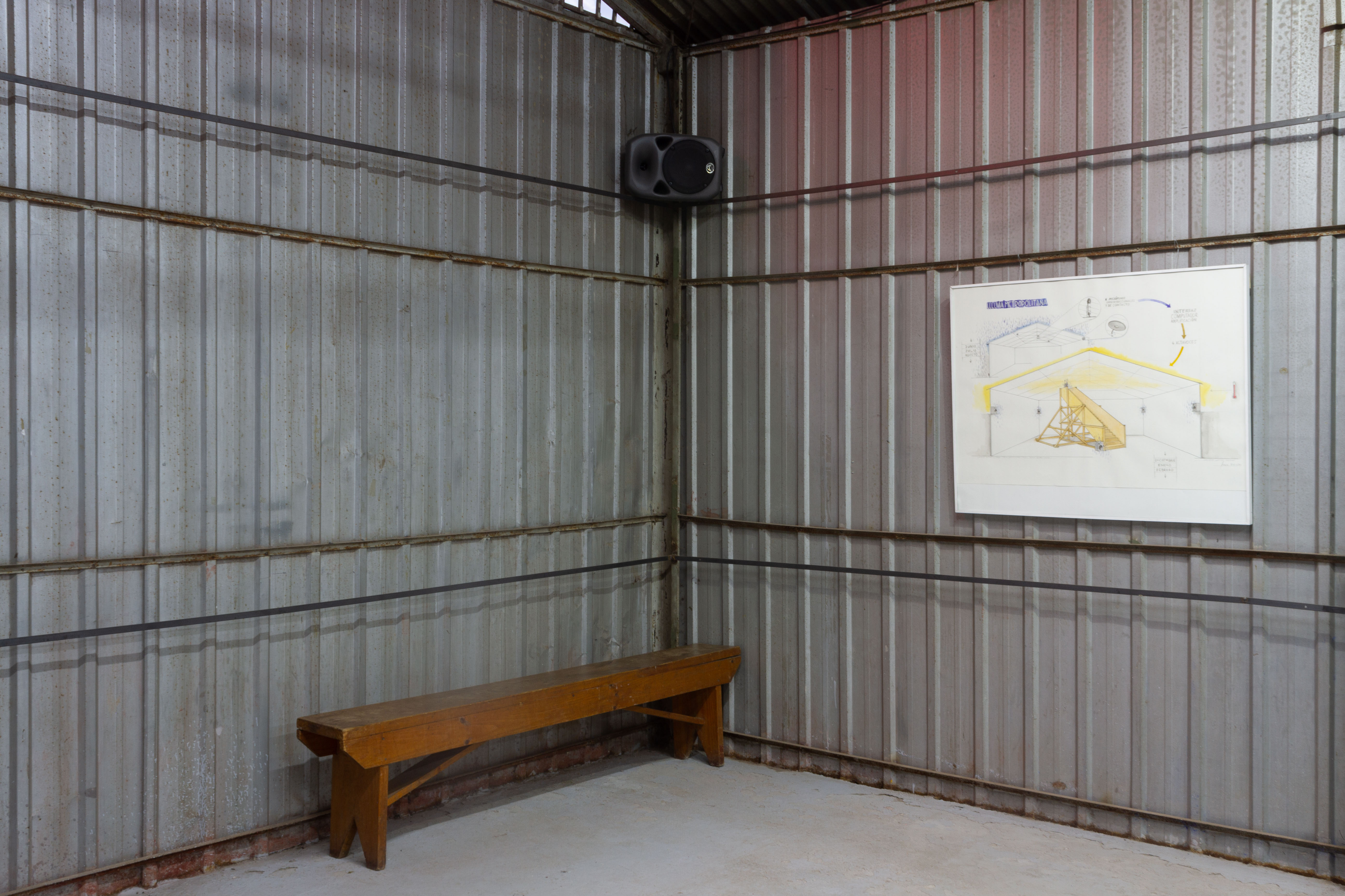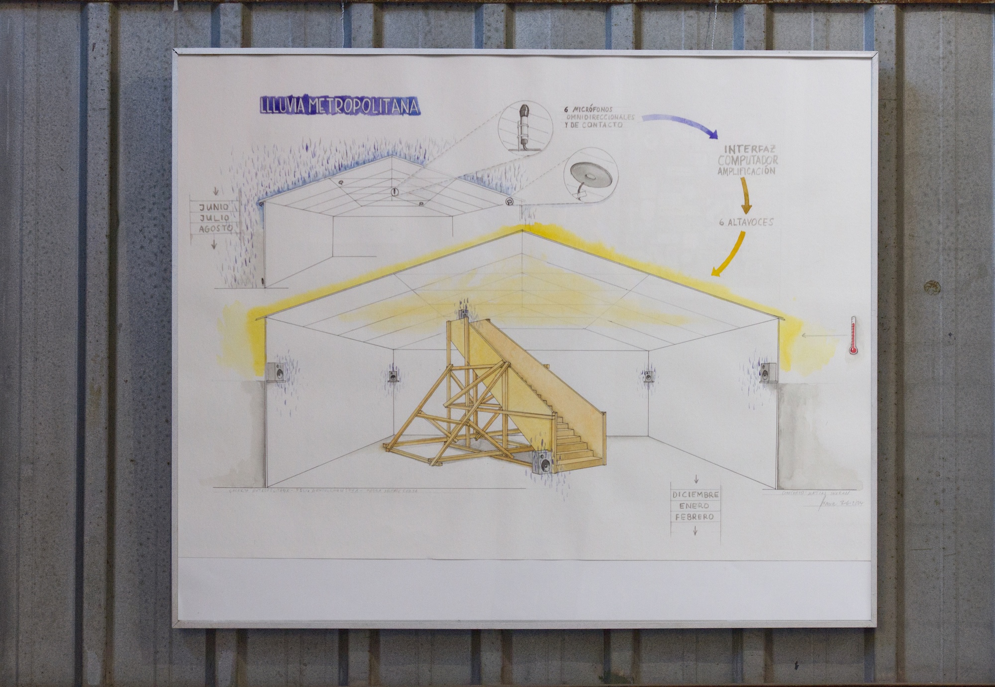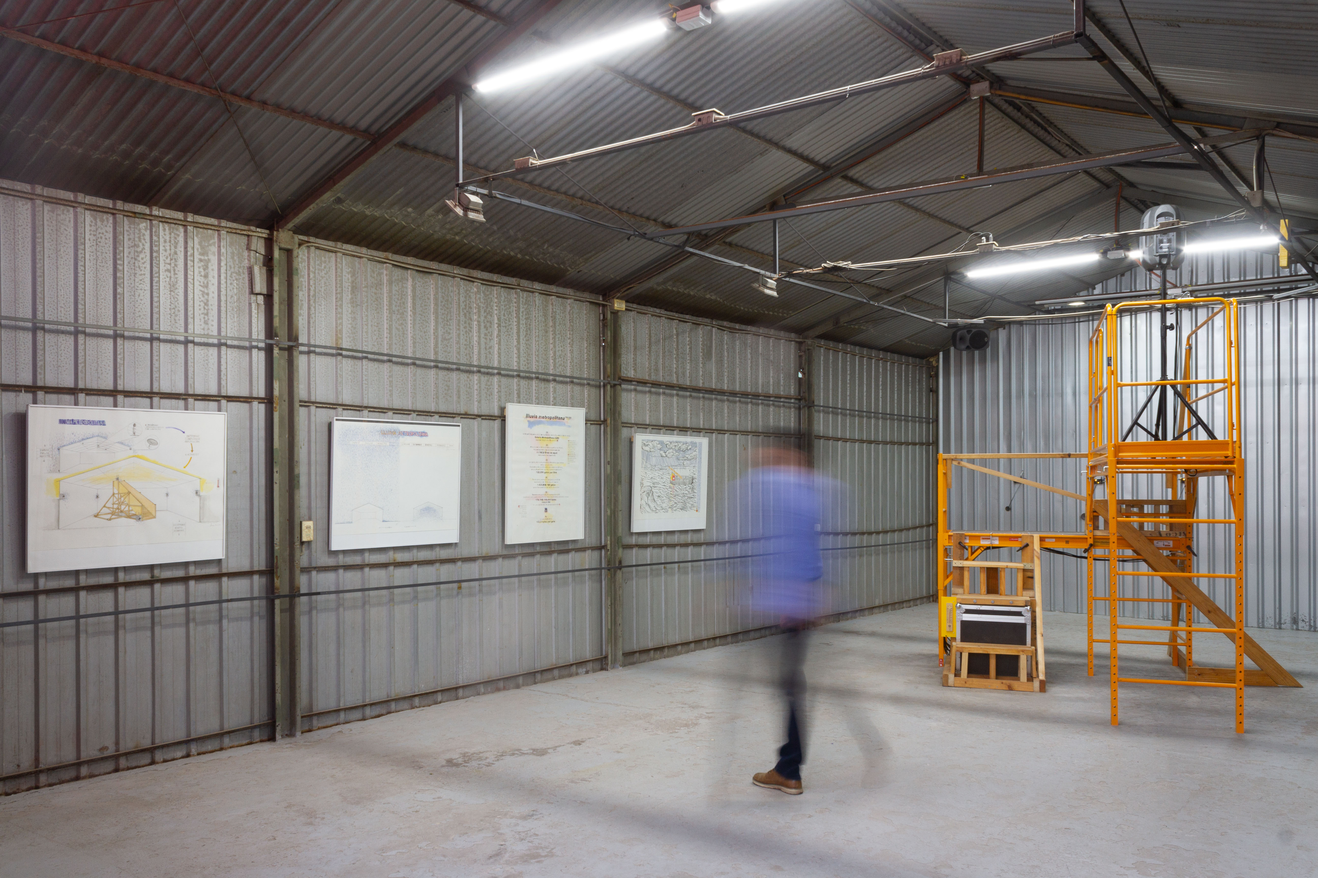 Llluvia Metropolitana emerge alrededor de una premisa sonora que intenciona la experiencia sensible con el clima. Los artistas instalaron un sistema de grabación en los techos de zinc de la galería durante el período de lluvias invernales. Parte de este registro se nos presenta desde una altura a la que podemos acceder cuando subimos por un andamio reforzado. Se propone entonces un encuentro entre una lluvia anterior, o quizás una lluvia en pausa, que frente a la sensación atmosférica calurosa y seca, propia de enero en la ciudad, propone a lo menos una disonancia.