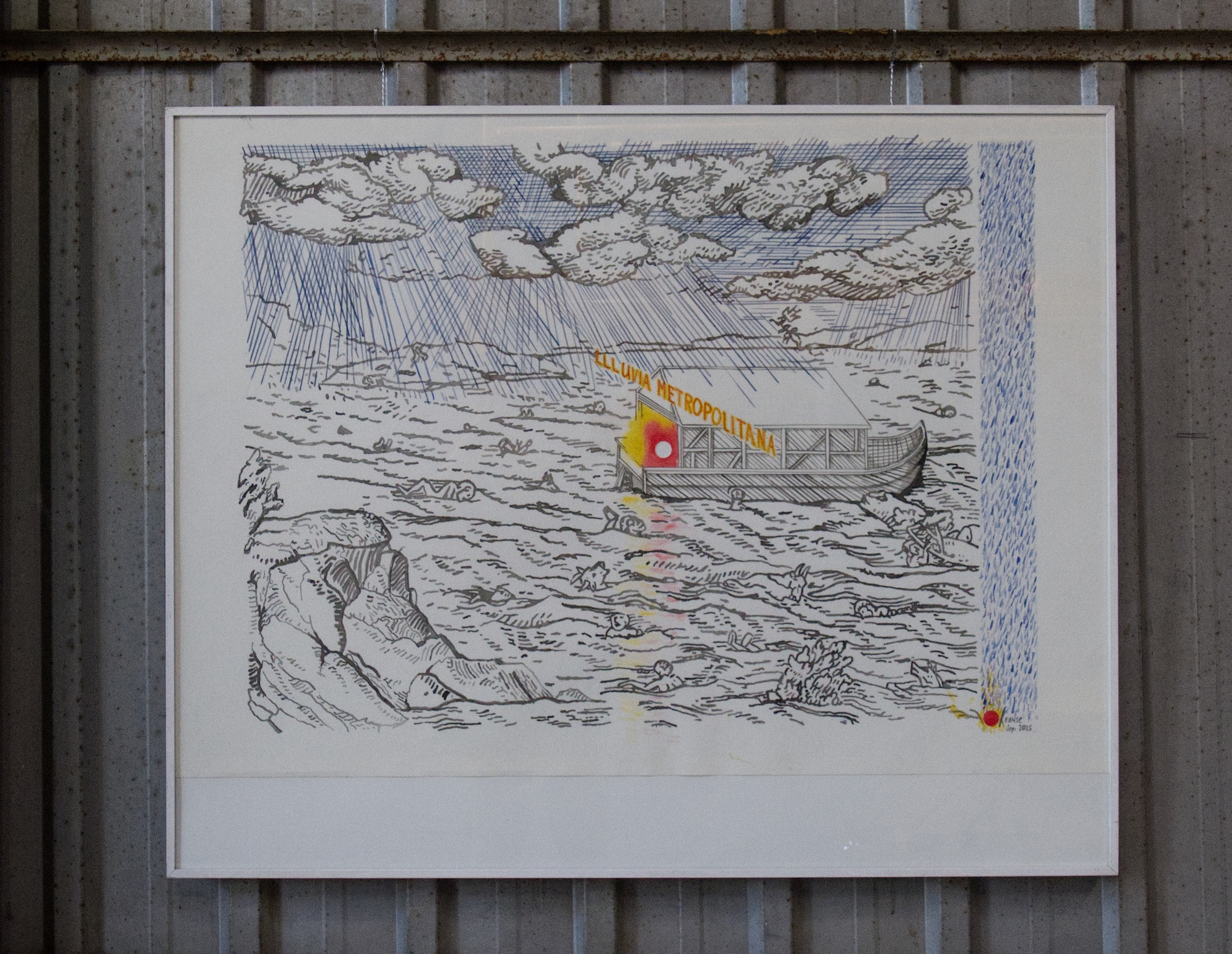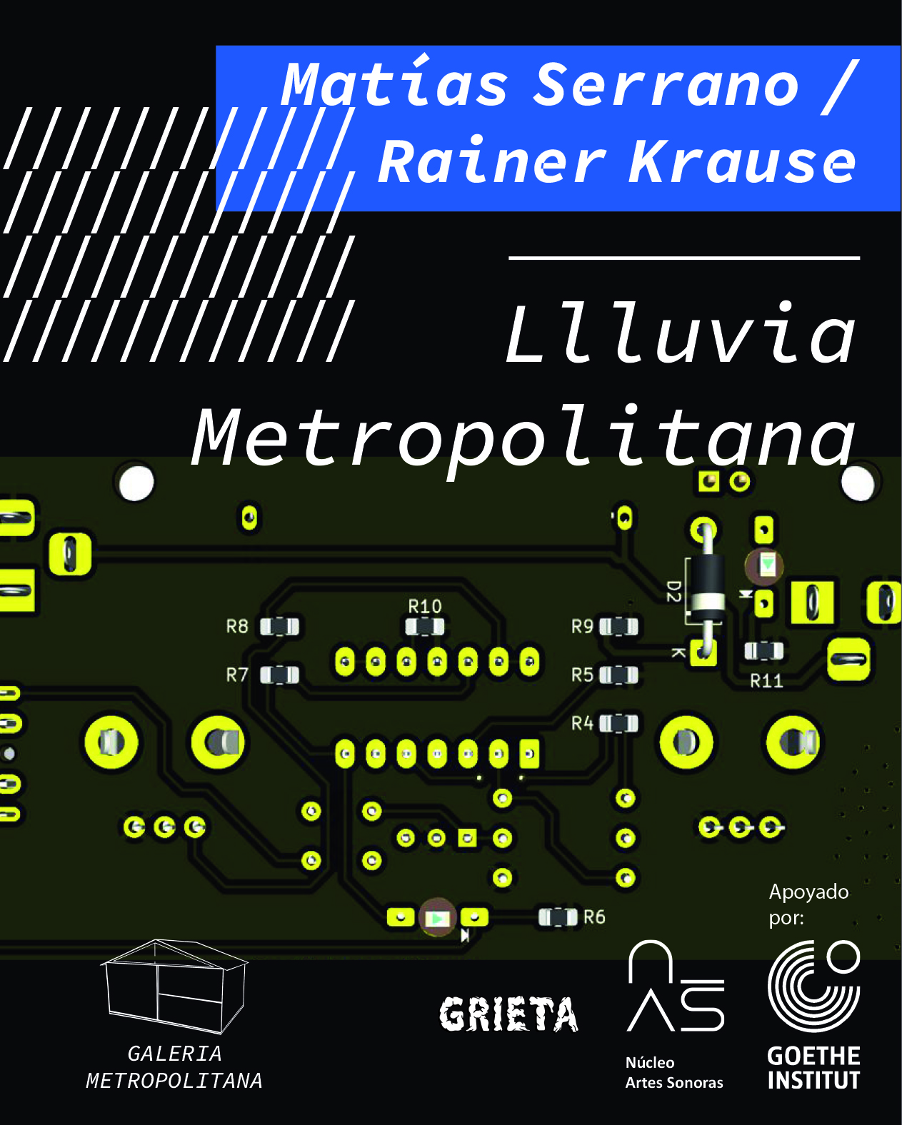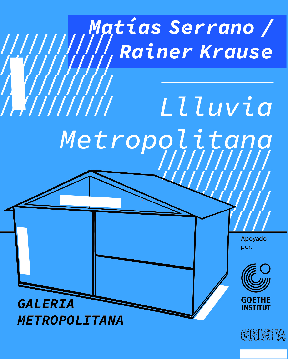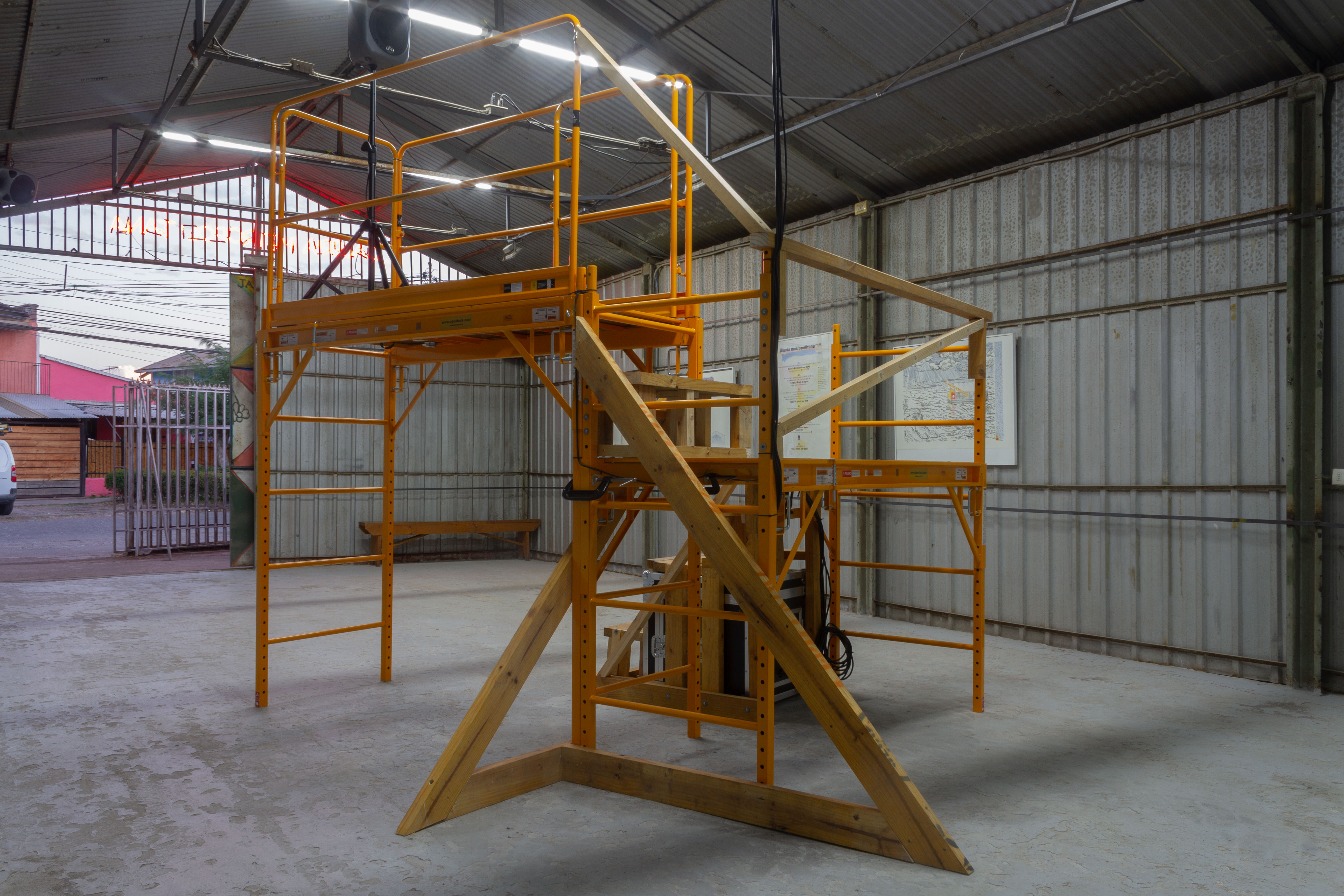 Llluvia Metropolitana emerge alrededor de una premisa sonora que intenciona la experiencia sensible con el clima. Los artistas instalaron un sistema de grabación en los techos de zinc de la galería durante el período de lluvias invernales. Parte de este registro se nos presenta desde una altura a la que podemos acceder cuando subimos por un andamio reforzado. Se propone entonces un encuentro entre una lluvia anterior, o quizás una lluvia en pausa, que frente a la sensación atmosférica calurosa y seca, propia de enero en la ciudad, propone a lo menos una disonancia.