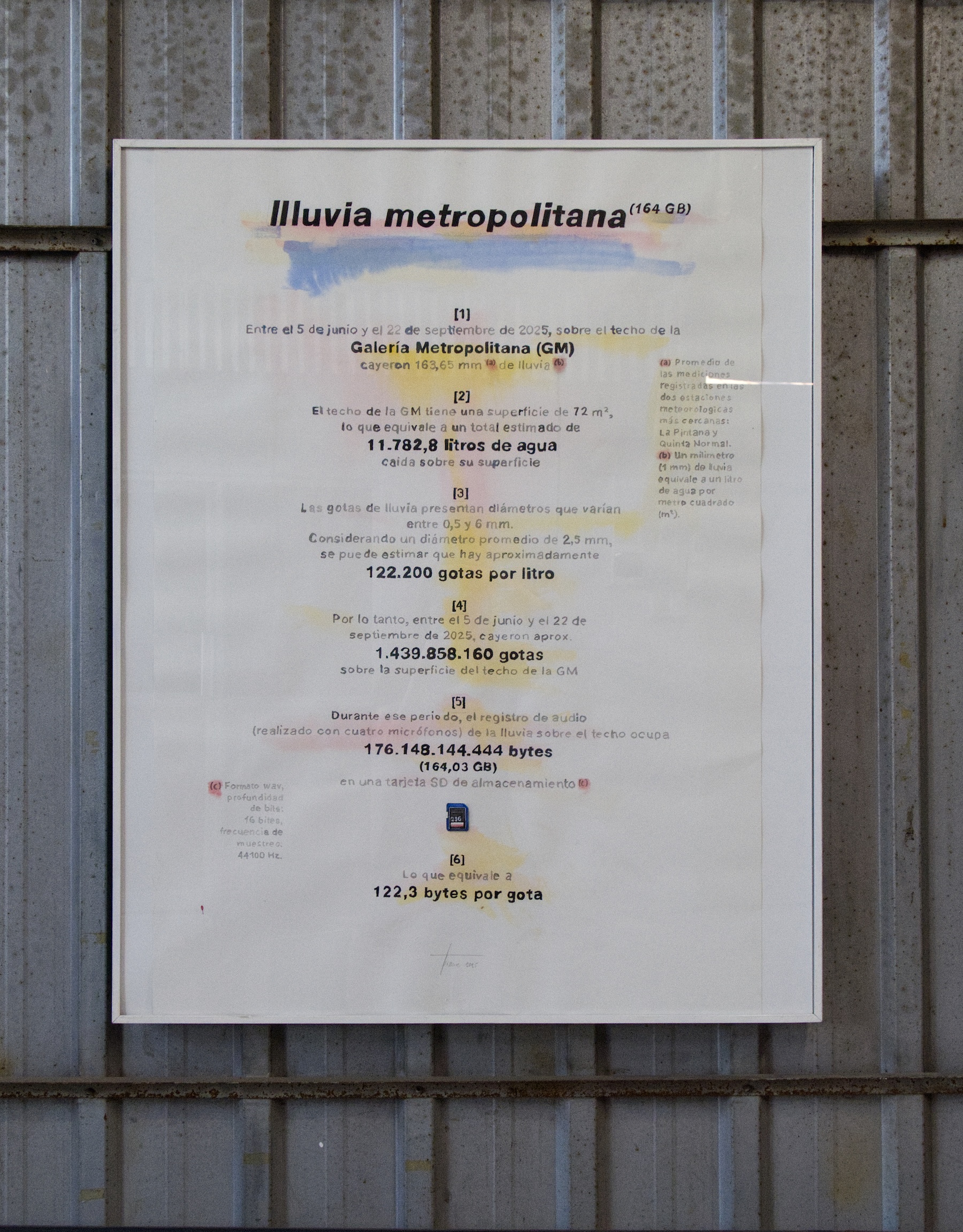 El proyecto expositivo consiste en una sola gran obra ensamblada a partir de elementos co-construidos entre Rainer y Matías, y de ejercicios realizados de manera independiente. El eje de la muestra es el sonido de la lluvia, que fue grabada por medio de un sistema de 4 micrófonos instalados cerca del techo de zinc del espacio durante los meses de junio, julio y agosto de 2025, que registraban en un computador controlado de manera remota el sonido de cada evento de lluvia. En total, se registraron alrededor de 164 GB de audio, lo que equivale a unas 126 horas de audio a 4 canales, aproximadamente. Estos fueron editados y mezclado en una banda sonora de 4 horas, que se reproduce en la sala durante el horario de apertura de la galería.