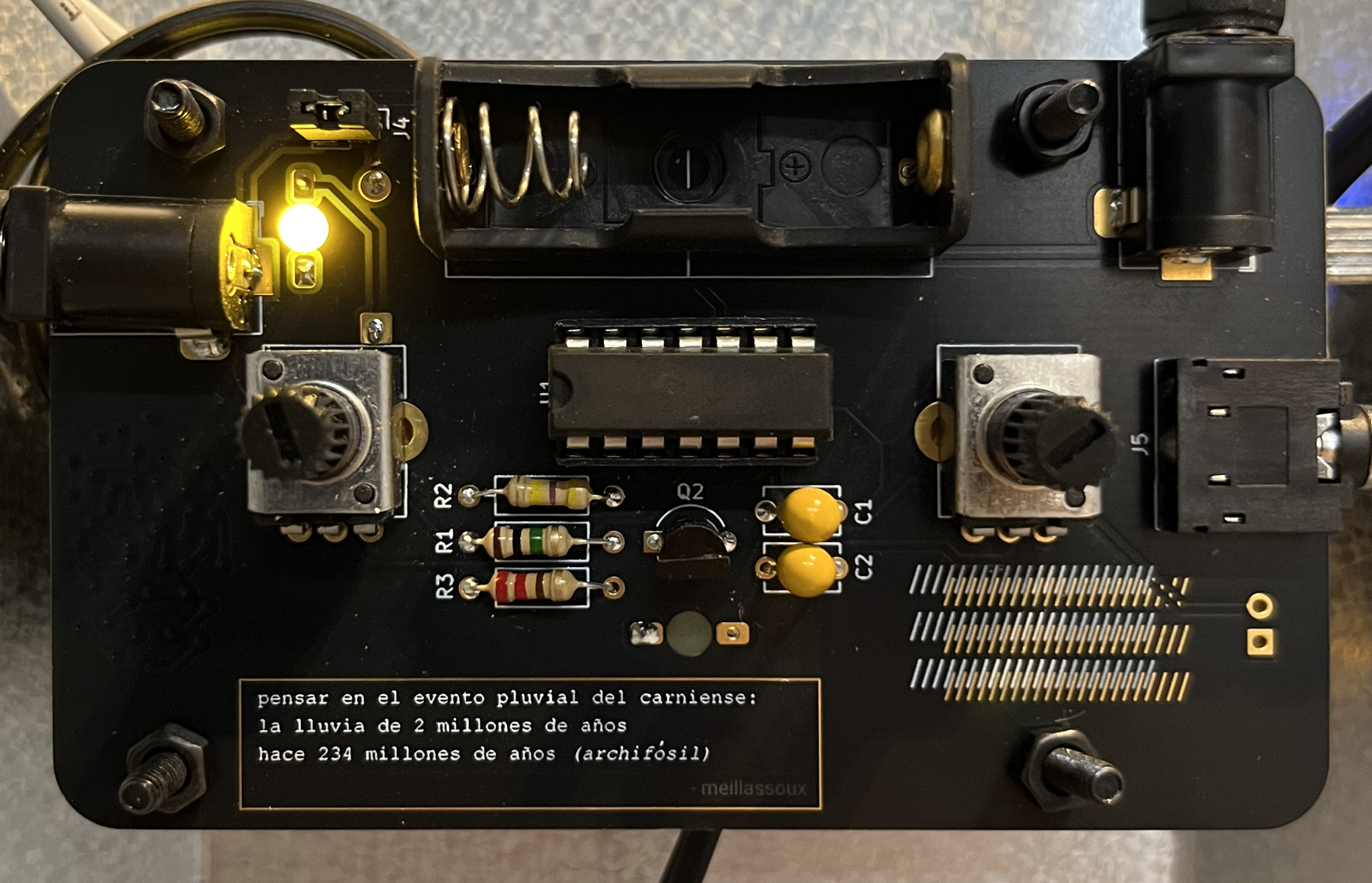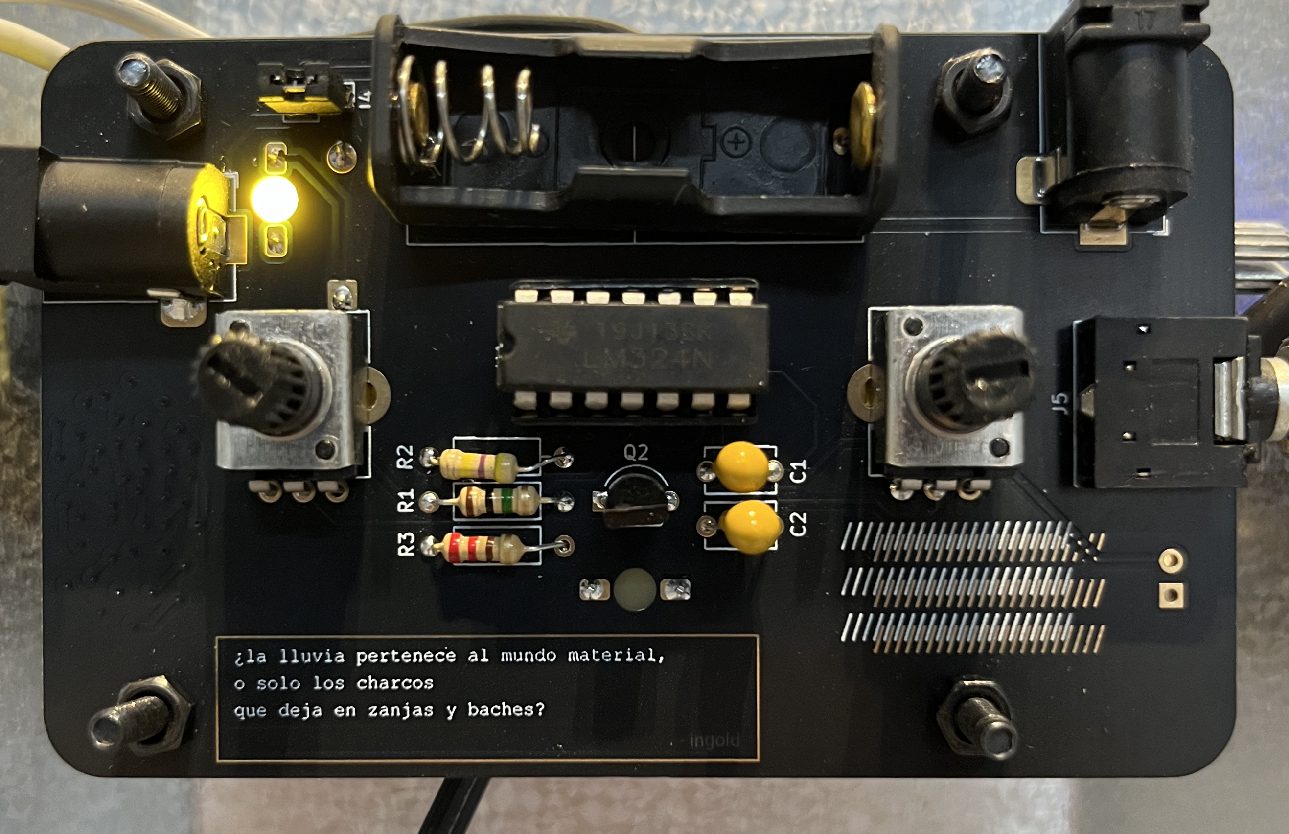 El circuito utiliza un transistor NPN de manera que genera un ruido rosa. Con la base conectada a negativo, el emisor a positivo y el colector desconectado, se genera una conducción inversa a través de la unión base-emisor. Esta configuración crea fluctuaciones aleatorias de corriente que producen variaciones similares al ruido rosa, lo que asemeja el sonido de una lluvia torrencial. Esta señal es llevada a un comparador simple, al que por medio de un potenciómetro se puede controlar cuantas "gotas" se dejan pasar.